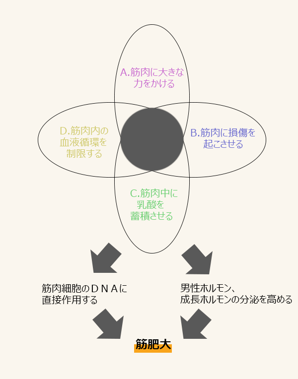 以上、①~④の刺激について自分なりに述べてきたわけですけど、四つの刺激と筋肥大のメカニズムの関係をよりいっそうわかりやすくするために、図にしてみました。