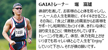 GAIAのパーソナルトレーニングはダイエット、プロポーション作り、肉体改造など、体型作りをメインとしてトレーニング指導しています。 まず、あなたの理想体型をお聞きし、目標達成のための最適なトレーニングメニューをプランニングしてマンツーマンの運動指導を行っていきます。 また、あなたの食習慣に合わせた食事指導のアドバイスも行っていきます。 運動経験の無い方、体力に自信の無い方、そんな方々にこそパーソナルトレーニングは一人一人の体力に合わせてスタートしていくので最適です。