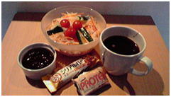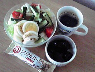 ブラックコーヒー サラダ (レタス、きゅうり、トマト、卵) コーヒーゼリー シリアルバー |