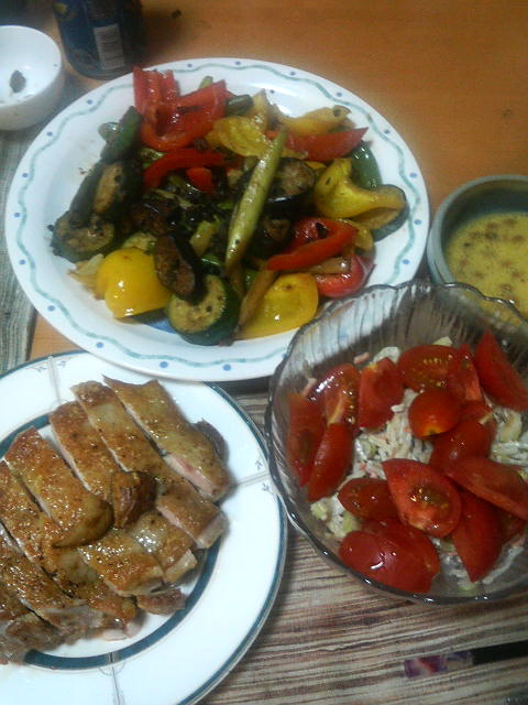 | 夏野菜のソテー ガーリックチキン トマトサラダ 納豆 |