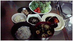 雑穀ご飯 麸とワカメ赤だし もずく酢 鶏ムネのつくね 白インゲン豆 ベビーリーフとトマト ぶり照焼半分 |