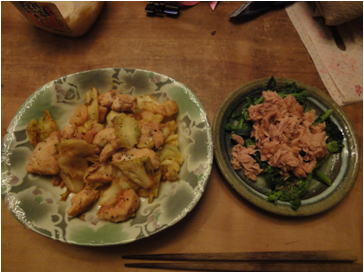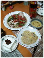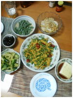 グリーンピースとトマトの卵炒め 新玉ねぎと油揚げの和え物 スナップエンドウ セロリ キュウリ 豆腐 破竹きんぴら 冷酒少々 |